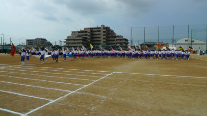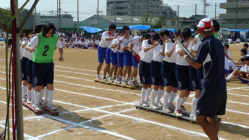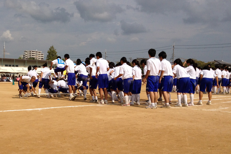 I also attended my main school’s Sports Festival. I’ve never seen anything quite like a Japanese sports festival. First, the students march around the track in army-style formation according to their grade and homeroom class in time to music played by the school band. Most look incredibly bored while doing this.